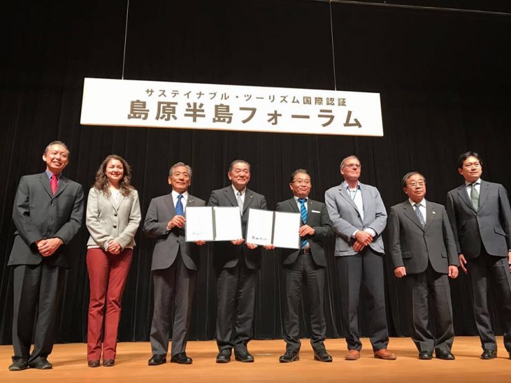 島原市長・雲仙市長・南島原市長・(一社)島原半島観光連盟会長が「島原半島 持続可能な観光地域づくり宣言」に署名。左は立会人を務めた高山さん(2017年11月、「サステイナブル・ツーリズム国際認証 島原半島フォーラム」)